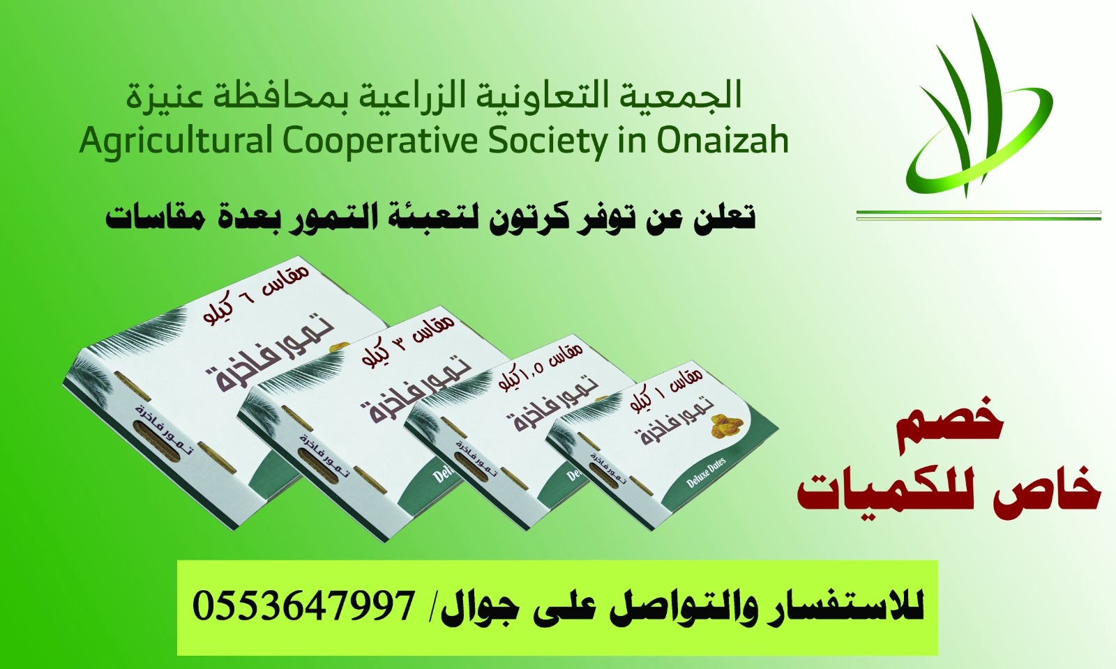 قامت الجمعية التعاونية الزراعية بمحافظة عنيزة بتوفير العبوات الكرتونية لتعبئة التمور لموسم جني ثمار النخيل لهذا العام 1444-1445هـ ...