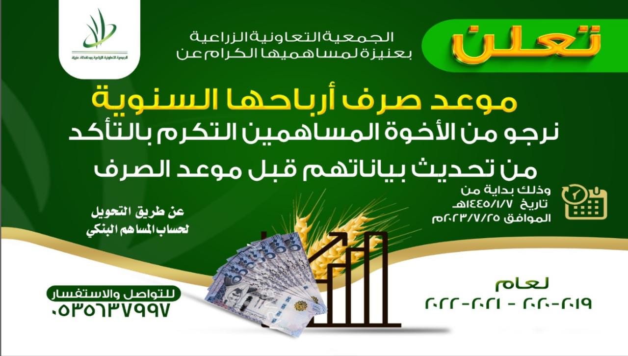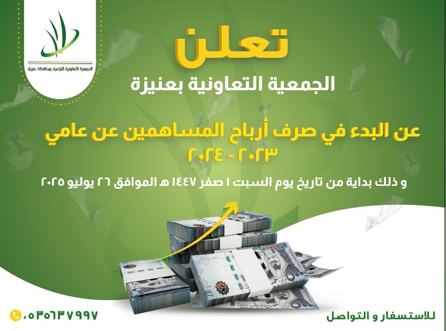 أعلنت الجمعية التعاونية الزراعية بمحافظة عنيزة عن توزيعها للأرباح السنوية عن الأعوام المالية 2023-2024م وسوف يبدأ التوزيع اعتباراً ...