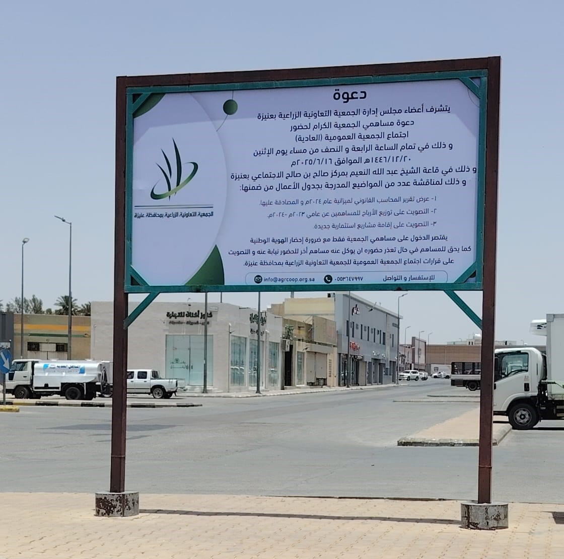 وجهت الجمعية التعاونية الزراعية بمحافظة عنيزة دعوة إلى مساهميها لحضور اجتماع الجمعية العمومية (العادية) عبر لوحات الشوارع والميادين ...